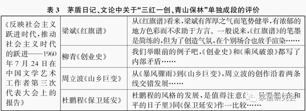 為了進一步了解茅盾對“三紅一創(chuàng)、青山保林”作品的評價評論情況,筆者以《茅盾全集》中的文論為基本線索,全面查閱了相關文獻,有關評價評論在篇幅上呈現(xiàn)了較為明顯的差異,對此進行了分類統(tǒng)計,繪制成表。對“三紅一創(chuàng)、青山保林”作品的評價評論情況集中主要出現(xiàn)在部分文章與報告之中,可以劃分為獨立成篇的評論、單獨成段的評價、只言片語的提及三種。