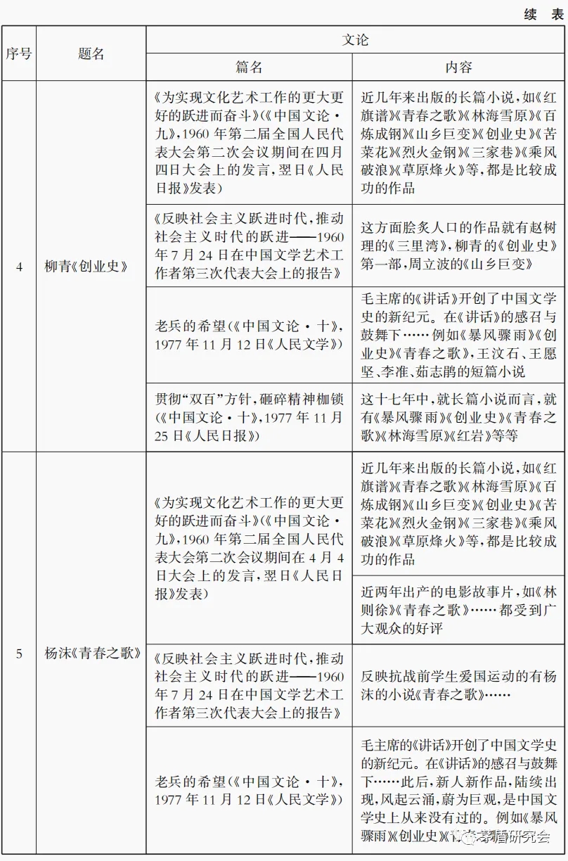 由表4可知,關于《紅巖》的提及是最少的,梁斌《紅旗譜》則較為頻繁,在一次報告中三次提及,關于曲波《林海雪原》提及時間跨度最長,最早在1958的《談青年業(yè)余創(chuàng)作——在沈陽市青年業(yè)余作者大會上的講話》(《中國文論·八》,1958年《文學青年》第七期),最晚為1977年的《貫徹“雙百”方針,砸碎精神枷鎖》(《中國文論·十》,1977年11月25日《人民日報》)。