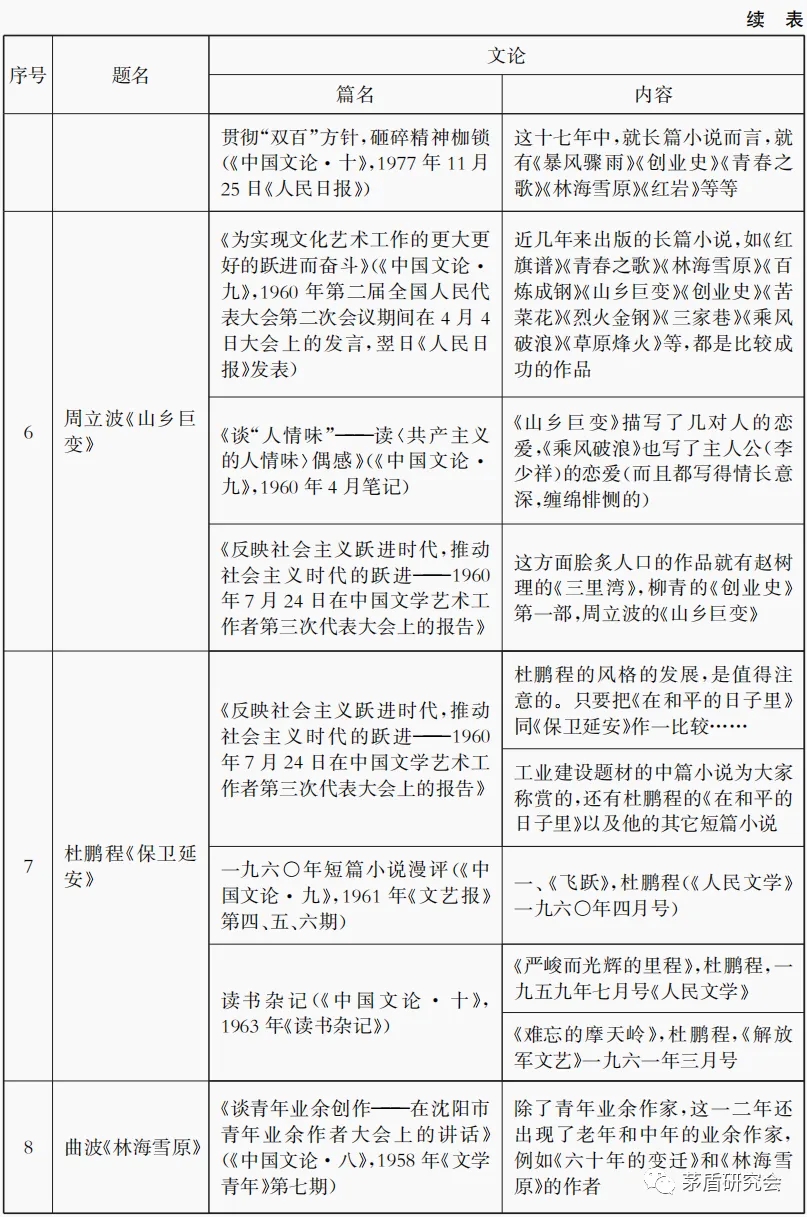 關于曲波《林海雪原》,藏書中未留存《創(chuàng)業(yè)史》,閱讀情況不詳,在讀書雜記(1959年)中,對《林海雪原》進行了讀書筆記式的評價評論,在《談青年業(yè)余創(chuàng)作——在沈陽市青年業(yè)余作者大會上的講話》(《中國文論·八》,1958年《文學青年》第七期)、《為實現(xiàn)文化藝術工作的更大更好的躍進而奮斗》(《中國文論·九》,1960年第二屆全國人民代表大會第二次會議期間在4月4日大會上的發(fā)言,翌日《人民日報》發(fā)表)、《反映社會主義躍進時代,推動社會主義時代的躍進——1960年7月24日在中國文學藝術工作者第三次代表大會上的報告》、《貫徹“雙百”方針,砸碎精神枷鎖》(《中國文論·十》,1977年11月25日《人民日報》)四篇文論中提及《林海雪原》。
