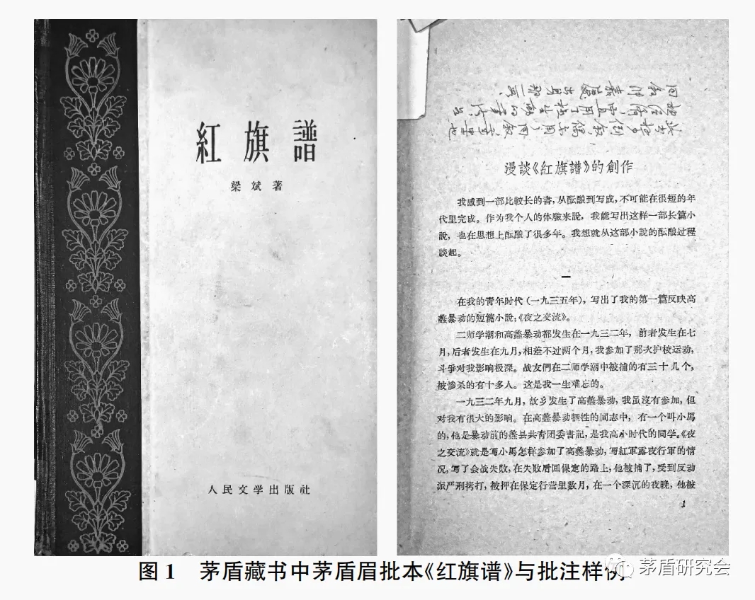 茅盾藏書中梁斌《紅旗譜》中的批注為初稿,《茅盾全集》中讀書筆記(1958年)根據(jù)茅盾未刊手稿情況刊發(fā),此手稿內(nèi)容與《紅旗譜》書中批注內(nèi)容構成茅盾對《紅旗譜》評論觀點的文本,此文本在當時并未公開發(fā)表,此文本中的觀點在報告《反映社會主義躍進時代,推動社會主義時代的躍進——1960年7月24日在中國文學藝術工作者第三次代表大會上的報告》中單獨成段關于《紅旗譜》單獨成段的評價觀點基本一致,并在此報告與報告《為實現(xiàn)文化藝術工作的更大更好的躍進而奮斗》(《中國文論·九》,1960年第二屆全國人民代表大會第二次會議期間在4月4日大會上的發(fā)言,翌日《人民日報》發(fā)表)中多次舉例提及。