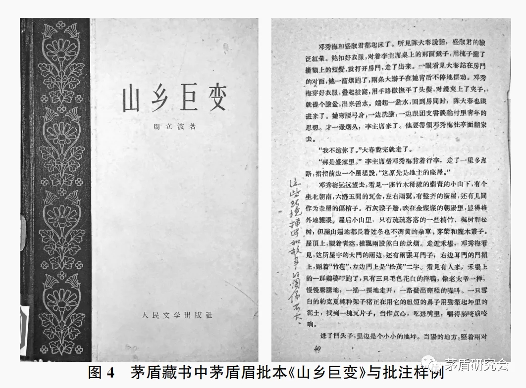 關于周立波《山鄉(xiāng)巨變》,在茅盾日記中5次出現(xiàn),1960年1月8日開始閱讀,1月19日閱讀完畢,藏書中《山鄉(xiāng)巨變》有批注,在《反映社會主義躍進時代,推動社會主義時代的躍進——1960年7月24日在中國文學藝術工作者第三次代表大會上的報告》中單獨成段評論《山鄉(xiāng)巨變》,在《為實現(xiàn)文化藝術工作的更大更好的躍進而奮斗》(《中國文論·九》,1960年第二屆全國人民代表大會第二次會議期間在4月4日大會上的發(fā)言,翌日《人民日報》發(fā)表)、《談“人情味”——讀<共產(chǎn)主義的人情味>偶感》《中國文論·九》,1960年4月筆記)、《反映社會主義躍進時代,推動社會主義時代的躍進——1960年7月24日在中國文學藝術工作者第三次代表大會上的報告》三篇文論中均提及《山鄉(xiāng)巨變》。在致蕭三(1951年9月18日)與致沙汀(1978年8月2日)書信中提到周立波。