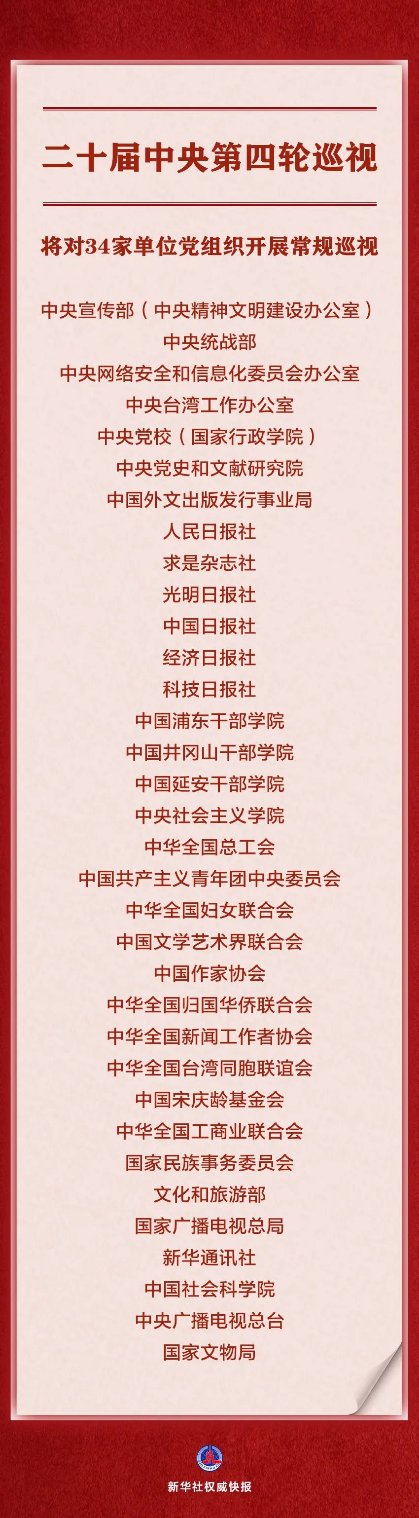 經(jīng)黨中央批準(zhǔn),二十屆中央第四輪巡視將對(duì)中央宣傳部(中央精神文明建設(shè)辦公室)、中央統(tǒng)戰(zhàn)部、中央網(wǎng)絡(luò)安全和信息化委員會(huì)辦公室、中央臺(tái)灣工作辦公室、中央黨校(國(guó)家行政學(xué)院)、中央黨史和文獻(xiàn)研究院、中國(guó)外文出版發(fā)行事業(yè)局、人民日?qǐng)?bào)社、求是雜志社、光明日?qǐng)?bào)社、中國(guó)日?qǐng)?bào)社、經(jīng)濟(jì)日?qǐng)?bào)社、科技日?qǐng)?bào)社、中國(guó)浦東干部學(xué)院、中國(guó)井岡山干部學(xué)院、中國(guó)延安干部學(xué)院、中央社會(huì)主義學(xué)院、中華全國(guó)總工會(huì)、中國(guó)共產(chǎn)主義青年團(tuán)中央委員會(huì)、中華全國(guó)婦女聯(lián)合會(huì)、中國(guó)文學(xué)藝術(shù)界聯(lián)合會(huì)、中國(guó)作家協(xié)會(huì)、中華全國(guó)歸國(guó)華僑聯(lián)合會(huì)、中華全國(guó)新聞工作者協(xié)會(huì)、中華全國(guó)臺(tái)灣同胞聯(lián)誼會(huì)、中國(guó)宋慶齡基金會(huì)、中華全國(guó)工商業(yè)聯(lián)合會(huì)、國(guó)家民族事務(wù)委員會(huì)、文化和旅游部、國(guó)家廣播電視總局、新華通訊社、中國(guó)社會(huì)科學(xué)院、中央廣播電視總臺(tái)、國(guó)家文物局等34家單位黨組織開(kāi)展常規(guī)巡視。