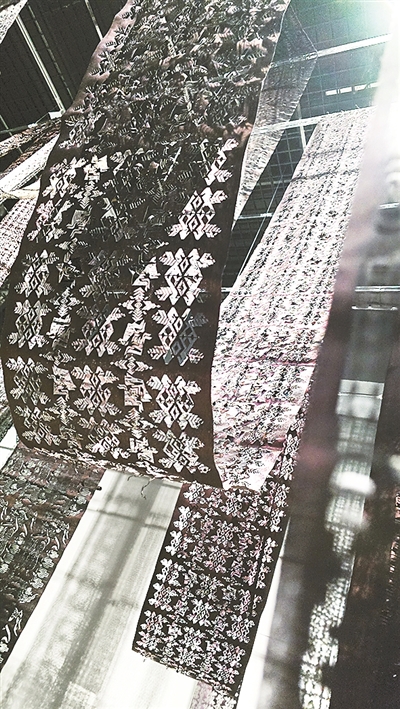數(shù)字長卷《紋·路》選取中國西部地區(qū)及中亞共建“一帶一路”國家具有代表性的傳統(tǒng)紋飾為主題,結(jié)合中國西南非遺亮布織物的獨(dú)特質(zhì)感,通過現(xiàn)代科技把傳統(tǒng)刺繡、織錦與剪紙紋飾融合在一起,以展覽現(xiàn)場光影效果的變化呈現(xiàn)出紋飾的歷史深度與文化意象。