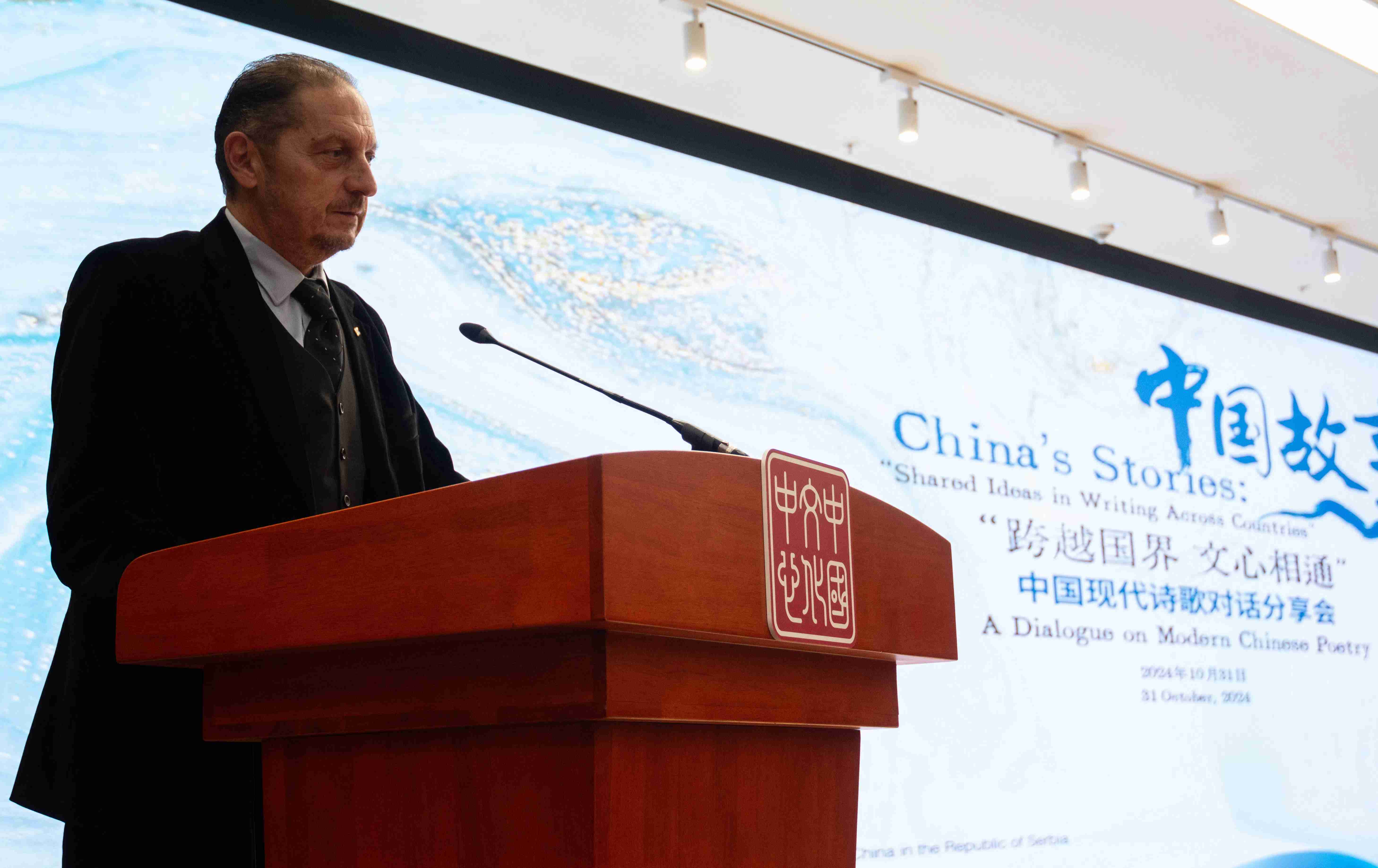 10月31日,由中國(guó)作家協(xié)會(huì)、中國(guó)駐塞爾維亞使館指導(dǎo),塞爾維亞中國(guó)文學(xué)讀者俱樂(lè)部、貝爾格萊德中國(guó)文化中心、中國(guó)圖書(shū)進(jìn)出口(集團(tuán))有限公司承辦的“跨越國(guó)界·文心相通”中國(guó)現(xiàn)代詩(shī)歌對(duì)話分享會(huì)在貝爾格萊德中國(guó)文化中心成功舉辦。由中國(guó)作協(xié)副主席、書(shū)記處書(shū)記邱華棟,作家雷平陽(yáng)、沈葦、李宏偉和戴濰娜組成的中國(guó)作家代表團(tuán)與塞爾維亞讀者代表等150余人深入交流,暢談文學(xué),共敘友誼。