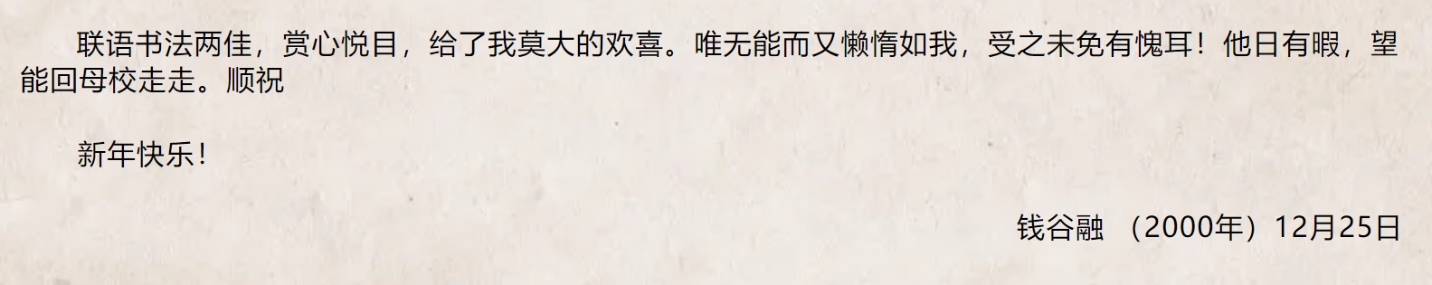 因?yàn)槊Γ瑫r(shí)也怕太多地打擾這位年逾八旬的老人,這次通信之后我就暫時(shí)放下此事,直到下學(xué)期快結(jié)束,臨近年底了,我才給錢先生寄了一張賀年卡,自撰一則并不講究的“聯(lián)語”記錄我對(duì)錢先生的印象:“讀書寫書,參透東西書趣,偶作長(zhǎng)歌驚風(fēng)雨;集茶品茶,嘗遍南北茶香,采得瑞草養(yǎng)容顏?!毕氩坏藉X先生竟然又很快回寄我一張賀年片,對(duì)我的所謂“聯(lián)語”和“書法”給了點(diǎn)贊,讓我十分慚愧!作為明信片的賀卡上雖然只有幾句話,但畢竟也是一封信,內(nèi)容也錄在這里: