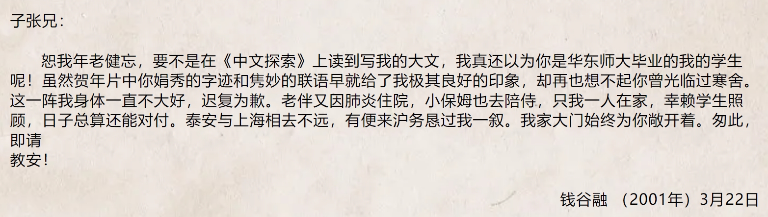 只是由“他日有暇,望能回母校走走”一語,可知錢先生把我誤認(rèn)為華東師大畢業(yè)的學(xué)生了。耄耋之年的錢先生門生眾多,我想這恐怕也難免。
