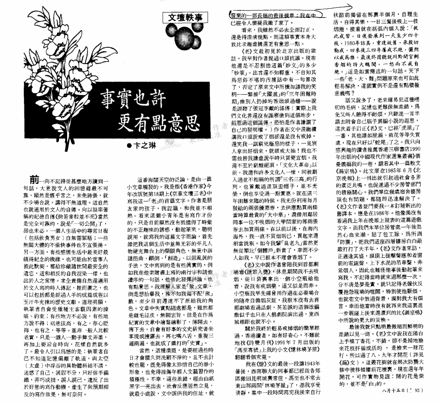 《事實(shí)》一文的第一段,即卞之琳先生自稱的“海闊天空的泛論”,談及文人的回憶錄“最不可靠”,存在刻意拔高,存心貶抑等狀況。不過,文章并未從文人回憶錄的不可靠或夸張深入下去,而是牽扯出一篇寫他的小文章,“失實(shí)點(diǎn)隨處都是”,讓他難安緘默。此文就是發(fā)表在《香港作家》1992年改版號(hào)十八期(1992年4月15日,總第四十二期)上的《京華文壇三老》中描寫卞之琳的“首篇文字”,作者為一個(gè)小青年,是“朋友家的孩子”、 “和我并不相熟”,“有寫作才份的,只是目前顯然沒有抵擋得了時(shí)髦的不正趣味的誘惑”。