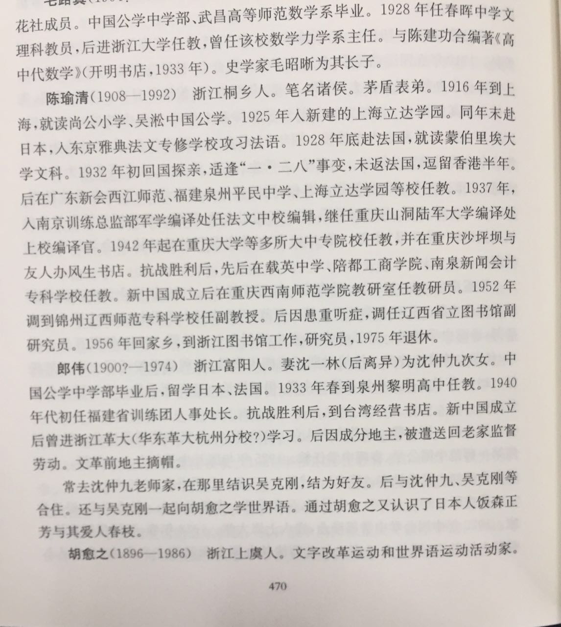 郎偉(1904?-1974)浙江富陽人,妻沈一林(后離異)為沈仲九次女。中國公學(xué)中學(xué)部畢業(yè)后,留學(xué)日本、法國。1933年春到泉州黎明高中任教。1940年代初任福建省訓(xùn)練團(tuán)人事處長,抗戰(zhàn)勝利后,到臺灣經(jīng)營書店。新中國成立后曾進(jìn)浙江革大(華東革大杭州分校?)學(xué)習(xí)。后因地主成分,被遣送回老家監(jiān)督勞動,文革前地主摘帽。常去沈仲九老師家,在那里認(rèn)識吳克剛,結(jié)為好友。后與沈仲九、吳克剛等合住,還與吳克剛一起與胡愈之學(xué)世界語。透過胡愈之又認(rèn)識了日本人飯森正芳與其愛人春枝。[8]