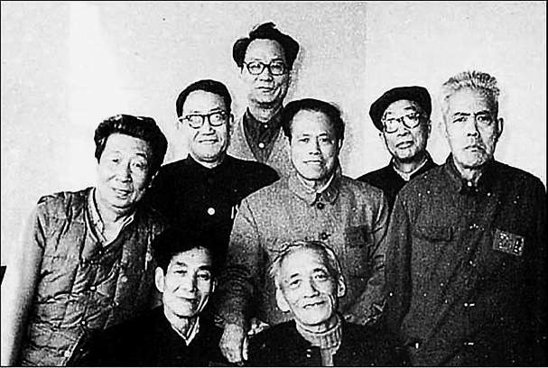 牛漢和朋友們(前排左起:魯藜、曾卓,后排左起:徐放、杜谷、牛漢、冀?jīng)P、綠原、路翎。1985年1月,北京)
