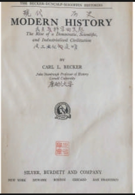 推車離開,路過一書攤時,一位賣書老板對我喊道:“過來照顧下生意嘛!”我說:“上新的書都看過了,沒有想要的。”他一邊叫我進來看看,一邊忙著用手機給別人發(fā)語音。我將他店里新的、舊的書又掃了一遍。發(fā)現(xiàn)上周看到過的一本英文書還在,有點破破爛爛的,布面的漆都快掉沒了,書脊和扉頁用膠帶粘住,紙張些許發(fā)黃,正文有不少地方用筆勾勾畫畫。1931年出版,倒是一本老書,康奈爾大學歷史系教授寫的《現(xiàn)代歷史》,也就是胡適先生留學的那所名校。上周詢價,他要二十塊錢,我出十塊錢,最后不了了之。現(xiàn)在再問,他竟要三十塊錢,還說是給老熟人的價格。我也不想揭穿他,只說十塊錢我拿走,多了就不要了。他又說:“老書!老書!”一邊嘀咕著,一邊把我放下的書拿在手里翻了翻。我徑直去推車,剛走了四五步,就聽見他喊:“拿去!”我就折回掃碼支付了十塊錢后,走了。