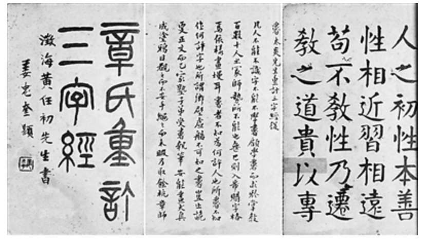 黃際遇從章太炎“揭橥救學(xué)弊論”所說(shuō)“不如效漢世之直授《論語(yǔ)》《孝經(jīng)》,與近代之直授《三字經(jīng)》《史鑒節(jié)要》”,考慮到“今庠序之間,舍本逐末,誠(chéng)可隱憂,亦非先生診方可治也”。為了家塾子弟在讀書時(shí)有一本“范本”,黃際遇開(kāi)始計(jì)劃重校并書寫章太炎的《重訂三字經(jīng)》。
