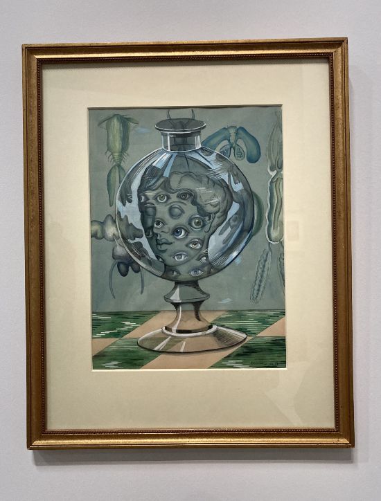 展覽展出的二百五十件作品涵蓋了繪畫(huà)、電影、攝影以及重要文獻(xiàn)。畫(huà)作中有來(lái)自世界各大美術(shù)館藏品中超現(xiàn)實(shí)主義畫(huà)派代表人物的知名作品,比如達(dá)利的油畫(huà)《偉大自慰者的臉龐》(Visage du grand masturbateur, 1929),瑪格麗特的《個(gè)人價(jià)值》(Les valeurs personnelles, 1952), 意大利畫(huà)家喬治·德·基里科(Giorgio de Chirico, 1888-1978)的《孩子的大腦》(Le cerveau de l’enfant, 1914) 與《愛(ài)之歌》(Le Chant d’amour, 1914), 德國(guó)畫(huà)家馬克斯·恩斯特(Max Ernst, 1891-1976)的《大森林》(Le grand forêt, 1927),米羅(Joan Miró, 1893-1983)的知名畫(huà)作《吠月之犬》(Chien aboyant à la lune, 1926)。除了這些明星藝術(shù)家之外,在本次展覽中能看到更多超現(xiàn)實(shí)主義派女藝術(shù)家的作品。其中有一些已小有名聲:朵拉·瑪爾,攝影家李·米勒(Lee Miller, 1907-1977),英國(guó)女畫(huà)家利奧諾拉·卡林頓(Leonora Carrington, 1917-2011), 法國(guó)先鋒攝影家克勞德·卡恩(Claude Cahun, 1894-1954), 德國(guó)藝術(shù)家梅拉·奧本海姆(Meret Oppenheim, 1913-1985),以及捷克超現(xiàn)實(shí)主義團(tuán)體創(chuàng)始人及代表性人物女畫(huà)家托伊恩(Toyen, 1902-1980)。另一些至今依然鮮為大眾所知的女藝術(shù)家的作品也得到了呈現(xiàn),比如英國(guó)超現(xiàn)實(shí)主義先鋒畫(huà)家伊賽爾·科爾庫(kù)洪(Ithell Colquhoun, 1906-1988),法籍匈牙利畫(huà)家朱迪特·雷格爾(Judit Reigl, 1923-2020), 意大利畫(huà)家萊昂諾爾·菲妮(Leonor Fini, 1907-1996), 墨西哥西班牙裔畫(huà)家瑞梅迪奧斯·瓦羅(Remedios Varo, 1908-1963), 美國(guó)超現(xiàn)實(shí)主義派女畫(huà)家海倫·倫德伯格(Helen Lundeberg, 1908-1999), 加拿大魁北克藝術(shù)家米米·帕倫特 (Mimi Parent,1924-2005),法國(guó)藝術(shù)家亞內(nèi)·勒·圖梅蘭(Yahne Le Toumelin,1903-2023), 英國(guó)藝術(shù)家及精神學(xué)家格蕾絲·帕爾索普(Grace Pailthorpe, 1883-1971),還有難得一見(jiàn)法籍埃及詩(shī)人喬伊斯·曼蘇爾(Joyce Mansour, 1928-1986)……
