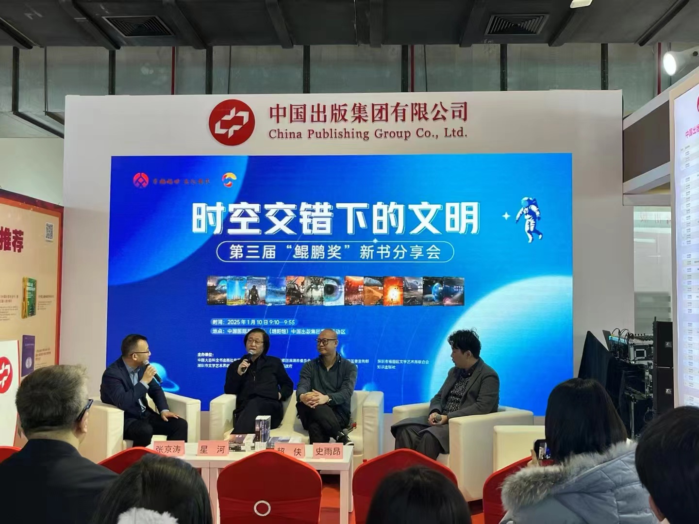 1月10日,“時空交錯下的文明:第三屆‘鯤鵬獎’新書分享會”在第37屆北京圖書訂貨會上舉行。中國作家協(xié)會科幻文學(xué)委員會委員、中國科普作家協(xié)會常務(wù)理事、科學(xué)文藝專業(yè)委員會主任星河,“鯤鵬獎”獲得者史雨昂等與會?!蚌H鵬獎”獲得者歐陽子毅和徐煒軒以視頻的方式參加活動?;顒佑芍R出版社常務(wù)副社長張京濤主持。