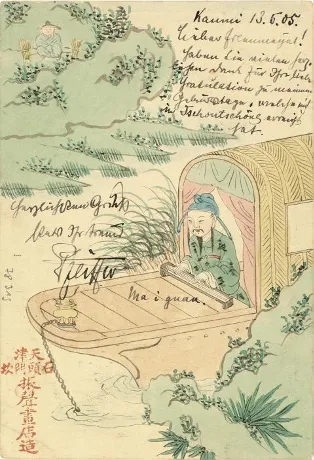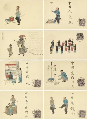 手繪明信片誕生在這個“機(jī)械復(fù)制”為時髦的時代,顯然是不合時宜的。實(shí)用品以人工繪制,耗時又費(fèi)力,但附著于郵政明信片,反倒是舊瓶裝新酒,是一種深入淺出的新玩意兒,在對東方抱有獵奇心態(tài)的使用者,也就是那些來華洋人看來,明信片不費(fèi)巨資,卻難得手工定制,不僅別出心裁,品位還不凡,值得向遠(yuǎn)方的親人炫耀。