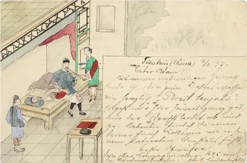 德國郵資明信片《問診圖》,郵路:此片書寫并寄出于 1897 年 11月13日,由德國在天津設(shè)立的客郵局寄出。明信片于12月23日抵達(dá)德國海德堡(Heidelberg),隨后在12月24日抵達(dá)目的地德國埃爾福特(Erfurt)。這片明信片是當(dāng)年德國寄信人直接從德國國內(nèi)帶回的空白郵資明信片,交由中國藝術(shù)家繪制后,再寄回國內(nèi)