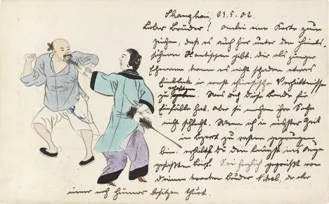 商行明信片《悍婦毆夫圖》,郵路:1902年5月23日上海德國客郵局收寄,6月30日抵達(dá)德國雷根斯堡(Regensburg)