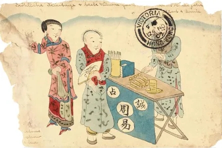 清二次片《算卦圖》,郵路:此片1907年陰歷10月16日福建福州寄出,11月24日在香港中轉(zhuǎn)后,12月27日到達(dá)德國城市