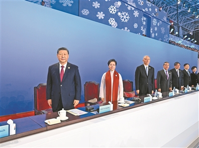 19時58分,在《和平——命運(yùn)共同體》的樂曲聲中,習(xí)近平和夫人彭麗媛,同國際奧委會主席巴赫、亞奧理事會第一副主席霍震霆等步入主席臺,向觀眾揮手致意。全場響起長時間的熱烈掌聲。