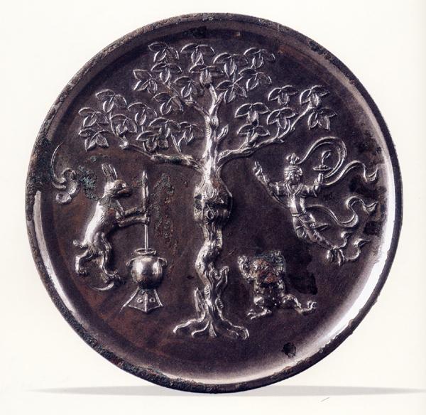 圓形月宮鏡畫面組合的另外一種形式為:左嫦娥,中桂樹,右玉兔(蟾蜍),這種組合形式的月宮鏡發(fā)現(xiàn)數(shù)量相對較少。