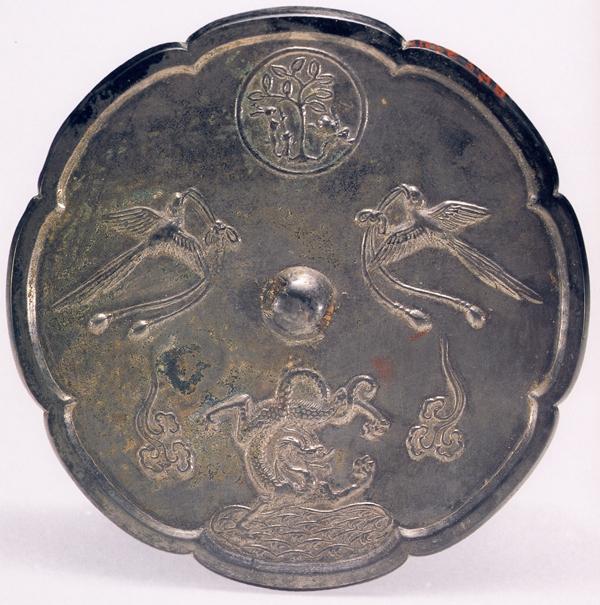 唐代的真子飛霜鏡,因鏡上田字格中的四字銘文而得名。鏡背上部中央為祥云托月,半個月亮若隱若現(xiàn)。也有人認為,鏡子上方的半圓形紋飾不是月亮,而是太陽的形象。鏡鈕形制較為奇特,是一只烏龜伏于荷葉之上。鏡鈕一側(cè),一位隱士“獨坐幽篁里,彈琴復(fù)長嘯”。另一側(cè)則是一只鸞鳥獨立石上。