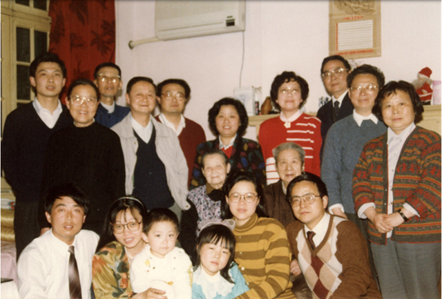 施蟄存與家人合影。前排左起劉鐵彪(施守琪丈夫)、施守琪(施蓬小女)、施守琪兒子、李盈(施守瑾女兒)、施守瑾(施蓬長女)、李斌(施守瑾丈夫)。中排左起陳慧華、施蟄存。后排左起施守琨(又名施浩凝,施邁兒子)、孫梅先(施蓬夫人)、施蓬(施蟄存次子)、施蓮(施蟄存長子)、施守珪(施蓮兒子)、許偉文(施守珪夫人)、金德文(施達夫人)、施達(施蟄存三子)、施邁(施蟄存四子)、鄭瑞芬(施邁夫人)。