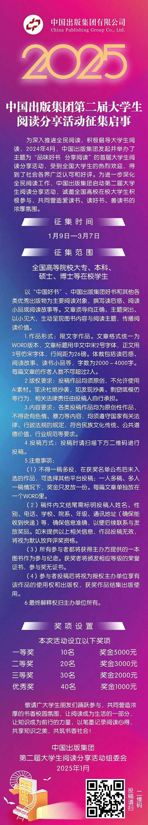 為進(jìn)一步深化全民閱讀工作,中國出版集團(tuán)于2025年1月9日正式啟動第二屆大學(xué)生閱讀分享活動,誠邀全國高校在校大學(xué)生積極參與,共同營造愛讀書、讀好書、善讀書的濃厚氛圍。歡迎踴躍投稿!