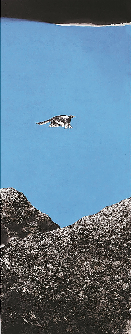 易新建的山水畫(huà)以大開(kāi)大合的構(gòu)圖建構(gòu)和宏偉雄闊的神韻,通過(guò)工致細(xì)密的皴法反復(fù)積染、疊加得以形成頗具節(jié)奏感和韻律感的亞抽象意境,這種神韻和意境亦真亦幻、亦虛亦實(shí),“惚兮恍兮,其中有象,恍兮惚兮,其中有物”。在他筆下,意象圖式暗藏云蒸霞蔚、巍峨巨嶂、奔流江河、清泉印月、羚羊佇立、飛鳥(niǎo)凌空,無(wú)一不蘊(yùn)含著藝術(shù)家對(duì)萬(wàn)物的情懷、對(duì)山河的摯愛(ài)以及由此產(chǎn)生的心境傾訴,藝術(shù)家的心靈徜徉于超越時(shí)空、幽邃靜謐的審美幻境,在天澄水清、氣韻升騰的寰宇間格物致知、放逸情思……易新建將中國(guó)傳統(tǒng)山水畫(huà)與西方素描的黑白灰關(guān)系、油畫(huà)的光影變化以及版畫(huà)的切割式力感、設(shè)計(jì)的創(chuàng)意性互滲融會(huì),由此走向了頗具新語(yǔ)境和新境象的當(dāng)代山水畫(huà)拓新之路。