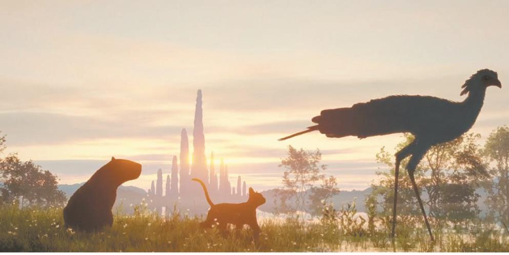 《貓貓的奇幻漂流》是個(gè)很可愛的片名,然而影片原名只有一個(gè)單詞,直譯是“漂流”。電影開始于人類退場的世界,人類文明的遺跡和自然的山川森林被肆虐的洪水覆蓋,一只幸存的小黑貓僥幸上了一艘帆船,遇到情緒穩(wěn)定的水豚,它們四處漂流,陸續(xù)有新的伙伴加入——愛撿破爛、計(jì)較身外之物的狐猴,性格樂天、酷愛社交的金毛犬,以及善良、有理性、堅(jiān)持原則的蛇鷲。這是一目了然的動(dòng)物版“諾亞方舟”,每種動(dòng)物清晰地隱喻了個(gè)體或族群在社會(huì)化活動(dòng)中的特質(zhì),有高貴的善行,有共情的溫存,也有屈從于本能的局限。但這些動(dòng)物又不至于太“擬人”,年輕的導(dǎo)演金茲·茲巴洛迪斯沒有刻意地設(shè)計(jì)強(qiáng)戲劇的沖突和情節(jié),他聲稱自己不擅長寫對白,所以影片里的動(dòng)物角色都不會(huì)開口說話,也不需要旁白和字幕卡,這是人類語言缺席的世界,一部徹底的默片。