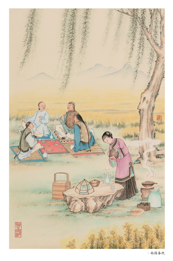 這套圖斷斷續(xù)續(xù)畫了四五年,本想去蘇州、無錫實地考察一番,但因身體和疫情原因一直未成行,中間生病又中斷了一段時間,幾次易稿。期間北京大學教授朱玉琪先生和中國人民大學國學院教授孟憲實先生看過后,提出希望有別于《紅樓夢》,更應側(cè)重于市井平民化的意見,有些部分進行了修改或重繪。老朋友章慎生先生去蘇州出差,拍一些蘇州風貌的照片發(fā)給我作素材參考。畫稿還得到了中國工筆畫學會原常務副會長、《紅樓夢》郵票設計者蕭玉田先生的指導。老先生對一些構(gòu)圖細節(jié)進行了指教,我受益良多。中國紅樓夢學會會長張慶善先生,多年來一直在工作和學習中給予我支持關照,也見證了我的成長,對于這次的作品,提出了中肯的意見,并答應幫我寫序言。我特意請沈陽大學文化傳媒學院的孫熙春師弟為此書篆刻印鑒兩方,一方為“浮生六記”四字,一方為馮老《枕上再題曹雪芹家世》詩中的一句“楝樹花開終結(jié)子”作為終結(jié)。另外我愛人王金亮先生,對我大力支持,承擔了家里的一應事情,使我能心無旁騖地專心做事。