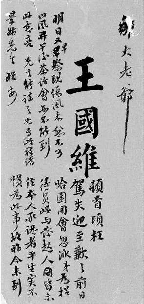 前文所述王國維名刺上的“短信”內(nèi)容為:“頓首。頃枉駕失迎,至歉至歉。前日哈園開會,忽派弟為招待員,此與發(fā)起人皆未經(jīng)本人承認(rèn)者。平生實不慣為此事,故昨、今未到,明日又早祭,現(xiàn)傷風(fēng)未愈,不可以風(fēng),并午后茶話會亦不能到,此意亮先生能諒之也。專此,敬請景叔先生晚安?!?/p>
