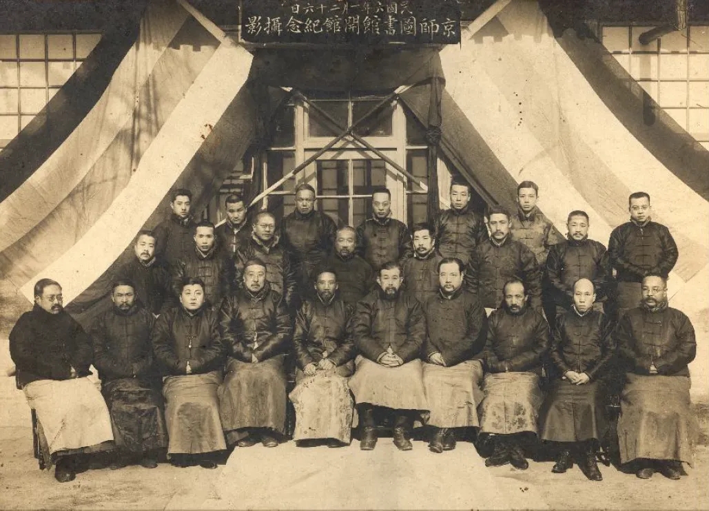 京師圖書館設立于1909年,最早位于廣化寺。經(jīng)魯迅等多方努力,京師圖書館得以改建。1917年1月26日新館在方家胡同開館,這是開館紀念合影。二排左5為魯迅。