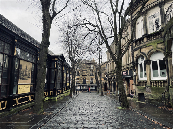 往哈羅蓋特去的火車上,窗外風(fēng)景逐漸從城市轉(zhuǎn)為典型的英格蘭鄉(xiāng)村景觀,間或點綴著林地,雖已上午10點多,但冬日的晨霧還未散盡,陽光射下來,顯得頗有仙氣。哈羅蓋特給人的第一印象相當(dāng)好,街道是整齊的維多利亞時期建筑,沒有礙眼的新樓房,這里曾經(jīng)連續(xù)三年被選為英國“最樂居城市”。自16世紀(jì)此地發(fā)現(xiàn)溫泉以來,這里就成了全英國聞名的療養(yǎng)地,富人們拖著病體接踵而至,也讓城市財富得以積累。一圈走下來感覺這里明顯是流淌著“老錢”的地方,當(dāng)?shù)厝怂坪鯇ψ约旱某鞘袣v史非常自豪,幾乎每走幾步就會看到建筑物上掛著銘記歷史的“藍牌”——不過這兒統(tǒng)一用的是棕色底。