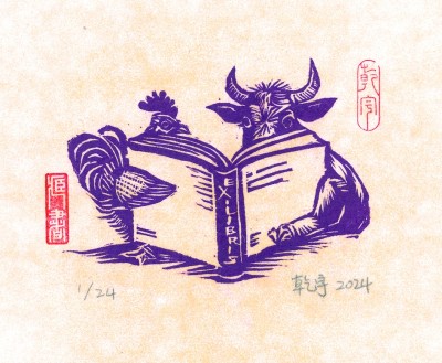 除了尺幅的改變,創(chuàng)作群體的拓展也影響著當(dāng)代藏書(shū)票的創(chuàng)作目的和表現(xiàn)主題,許多藝術(shù)家將藏書(shū)票視為表達(dá)個(gè)人情感和審美理念的獨(dú)立藝術(shù)作品,而不再拘泥于其功能性的彰顯。如武將創(chuàng)作的《個(gè)山》(圖⑧)再現(xiàn)了清代畫家朱耷《山水冊(cè)》中的山水景致,藝術(shù)家采用干刻法塑造景物,使得作品既具西方素描的細(xì)膩質(zhì)感,又兼具東方藝術(shù)韻味??梢哉f(shuō),創(chuàng)作者以藏書(shū)票為媒介,進(jìn)行了一場(chǎng)東方與西方、傳統(tǒng)與現(xiàn)代的審美對(duì)話。同時(shí),隨著創(chuàng)作群體的年輕化,許多當(dāng)代藏書(shū)票作品從不同角度展現(xiàn)出青年人的生活狀態(tài)和對(duì)閱讀的思考。邊坤平的作品《搗亂》(圖③)描繪了一只頑皮的黑貓正極力阻礙主人看書(shū)的一瞬,略顯夸張的造型和極富裝飾感的平面化語(yǔ)言,讓這充滿趣味的一幕更顯生動(dòng),引發(fā)了眾多當(dāng)代養(yǎng)貓人的共鳴。譚坦的作品《午后陽(yáng)光》(圖⑤)描繪了草地上或臥或坐的閱讀者,藝術(shù)家以刪繁就簡(jiǎn)的創(chuàng)作方式,通過(guò)隨性而松動(dòng)的線條勾勒,營(yíng)造出一種近似漫畫的松弛感。作者希望以此提醒自己和觀者:在快節(jié)奏的現(xiàn)代都市生活中,要試著把自己交給書(shū)籍,回歸閱讀所帶來(lái)的本真的愉悅。趙乾宇的《開(kāi)卷有益》(圖⑦)同樣饒有趣味,作品刻畫了一頭牛和一只雞正全神貫注地閱讀著同一本書(shū)的場(chǎng)景,旨在傳達(dá)無(wú)論讀者是何人,只要投身于閱讀之中,就必有所得。