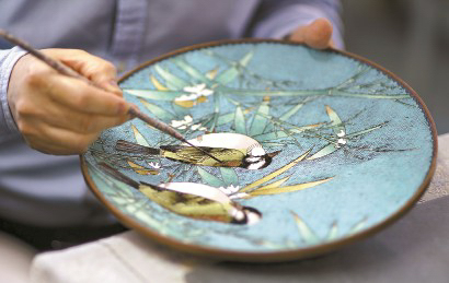 技師在為景泰藍(lán)工藝品進(jìn)行“點藍(lán)”。 新華社 發(fā)