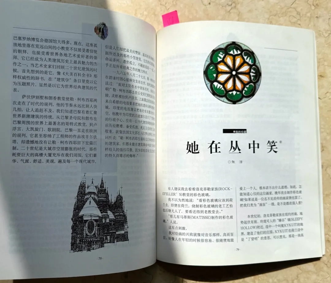 信中所說(shuō)文章,發(fā)表在張煒和我主編的《唯美》雜志上,這雜志其實(shí)只出了一期,因我工作調(diào)動(dòng)而夭折。文章題目是《她在叢中笑》,寫洛克菲勒家族教堂里,馬蒂斯設(shè)計(jì)創(chuàng)作的彩色玻璃,同時(shí)配發(fā)一幅張潔拍攝的彩色圖片。馬蒂斯完成這件彩色玻璃的設(shè)計(jì)兩天后就去世了,兩年后(1956年)才由工匠完成。張潔很為發(fā)現(xiàn)馬蒂斯這件藝術(shù)品,并寫文章介紹而得意,因?yàn)橛嘘P(guān)馬蒂斯的資料中沒(méi)人提起他這件最后的作品。