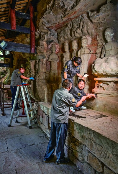 大足石刻研究院保護(hù)工程中心的文物修復(fù)人員正在進(jìn)行文物修復(fù)。