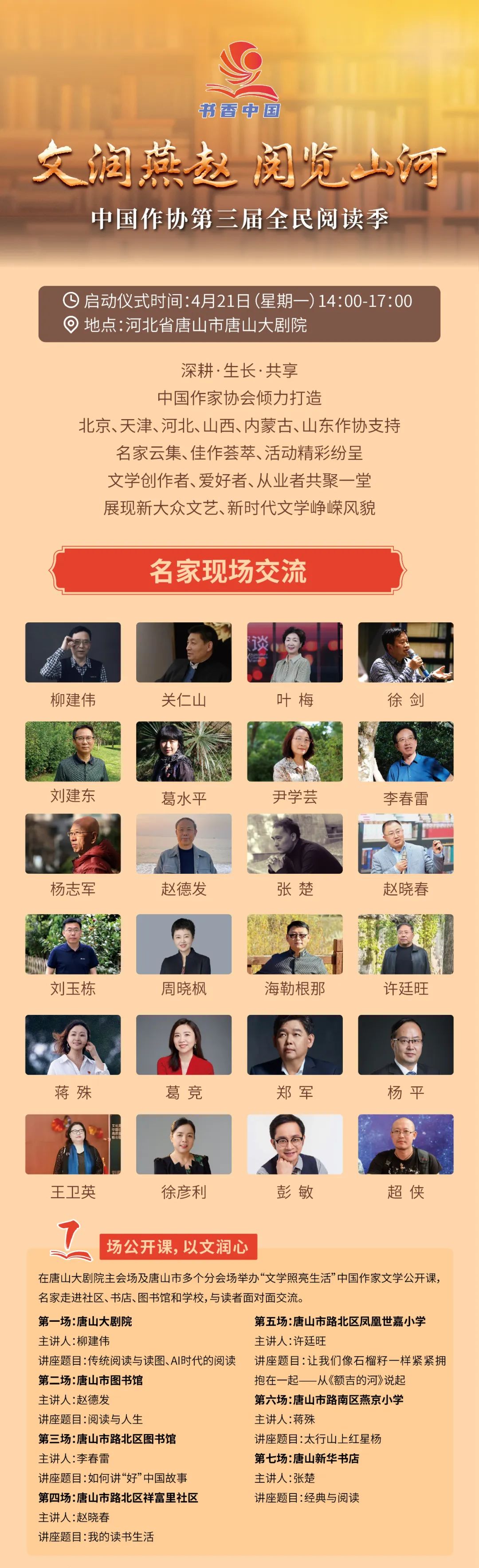 2025年世界讀書日期間,中國作協(xié)聯(lián)合華北地區(qū)北京、天津、河北、山西、內(nèi)蒙古五省市區(qū)及山東省作協(xié),共同舉辦以“文潤燕趙 閱覽山河”為主題的中國作協(xié)第三屆全民閱讀季。中國作家網(wǎng)將持續(xù)報道,敬請關(guān)注。