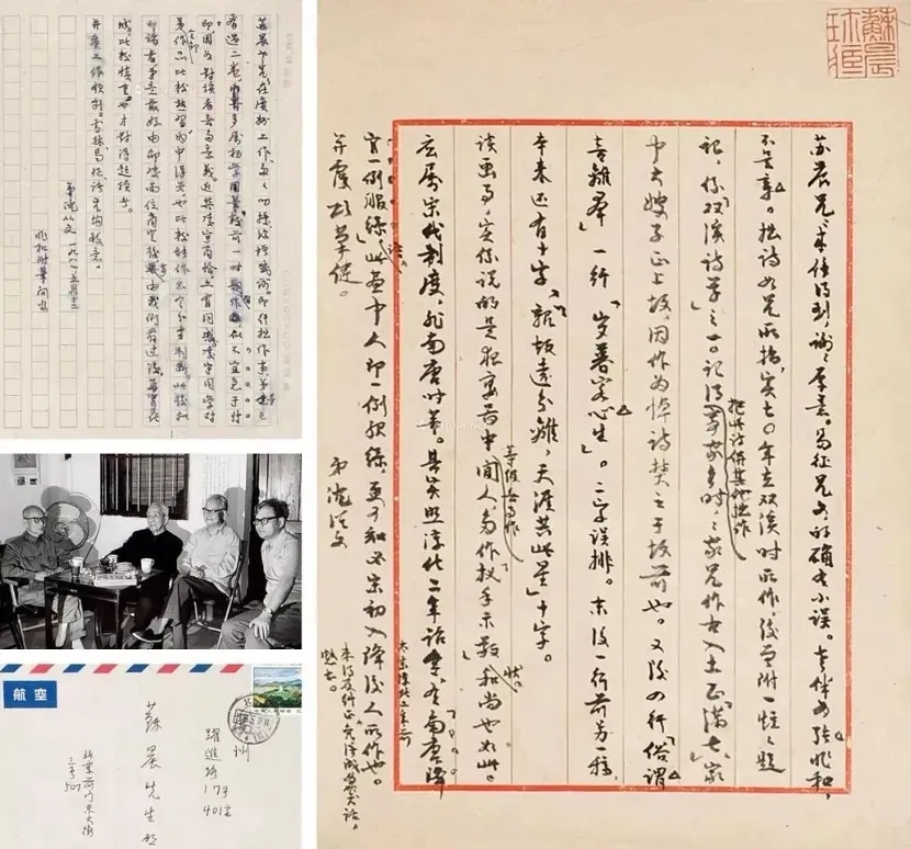 1981年5月12日信,是沈從文訪美回國,取道香港、廣州、長沙,于是年4月16日返京后寫給蘇晨的。一來對在廣州期間的叨擾表示感謝,二來在翻閱花城版《文集》的兩卷初樣后,認為早期習作較多,不宜急于印行,并告知此后由凌宇、邵華強負責編選(此點在其他書信中也多有提及)。信中值得一說的是所謂“叨擾”,這涉及到沈從文在廣州期間與容庚、商承祚的交游,此前的研究資料及《年譜》均有遺漏。據(jù)《年譜》記載,1981年4月2日,沈從文由王序、王亞蓉陪同前往中山大學拜訪容庚、商承祚。其實沈從文在廣州期間,與容庚、商承祚還有過一次會晤,據(jù)蘇晨《想起窄而霉小齋沈從文》記敘,沈從文某日打電話要到他家做客,蘇知道容商是沈的朋友,便告知沈其與容商也是熟人,便也約了容商二人,使沈容商三老在蘇宅會面。與1981年5月12日信拍出的還有一張?zhí)K晨與三老的合影,從蘇晨的描述,其家客廳掛有沈從文所書四百字的“琴條”,這也在照片中可以得到應證。據(jù)筆者判斷,沈從文這次在蘇宅與容商的會面,應該早于4月2日在中山大學的會面,一來4月4日沈從文便離開了廣州,時間倉促,不可能在兩天之內(nèi)會面兩次;二來赴容商所居的中山大學拜訪,更具禮數(shù),也算是對蘇宅會面的一次“回訪”。