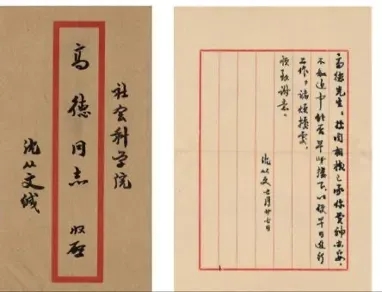 2017年12月24日由西泠印社拍賣有限公司舉辦的“2017年秋季拍賣會”之“中外名人手跡專場暨長言聯(lián)書法專題”專場拍出此二信,12月21日信共二紙,對開十行箋黑色毛筆豎寫;7月27日信共一紙,八行箋黑色毛筆豎寫。并附有一個信封,收信人信息是“社會科學院 高德同志 收啟”,寄信人信息是“沈從文緘”。二信輯校如下:
