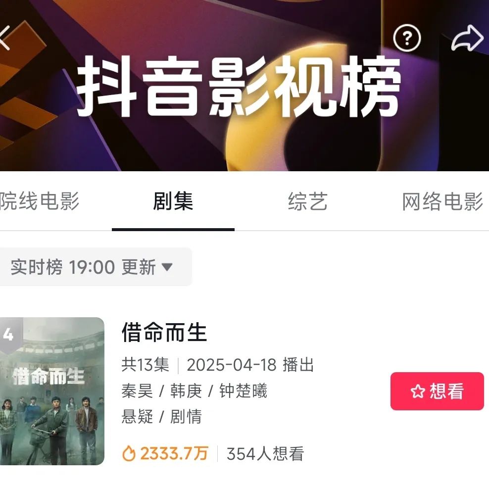 臨近開播,電視劇《借命而生》愛奇藝預(yù)約量突破150萬,抖音劇集榜熱度值達(dá)2333.7萬。