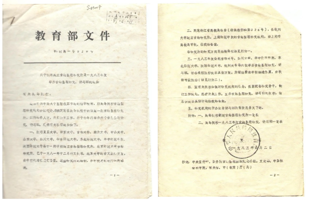 教育部副部長周林擔(dān)任國務(wù)院古籍整理出版規(guī)劃小組副組長后,在教育系統(tǒng)成立了全國高等院校古籍整理研究工作委員會,由周林同志兼任主任;1982年,教育部下發(fā)了經(jīng)國務(wù)院核準(zhǔn)的《高等院校開展古籍整理研究、培養(yǎng)整理人才的方案》,決定在全國有條件的高校成立若干古籍研究中心和增設(shè)古典文獻(xiàn)專業(yè)。在這個背景下,杭州大學(xué)于1982年9月6日向浙江省高教局提出申請,建立古籍研究所,由姜亮夫先生任所長,編制20人。于是浙江省高教局向教育部遞交報告,希望由教育部批準(zhǔn)杭州大學(xué)古籍研究所。1983年4月2日,教育部以“(83)教高一字020”號文件,“批準(zhǔn)復(fù)旦大學(xué)、南京大學(xué)、吉林大學(xué)、南開大學(xué)、中山大學(xué)、山東大學(xué)、四川大學(xué)、華東師范大學(xué)、東北師范大學(xué)、華中師范學(xué)院、陜西師范大學(xué)等十一所高校建立古籍整理研究所?!庇捎诤贾荽髮W(xué)不是教育部直屬院校,所以教育部文件是“同意浙江省高教局報告(浙高教字(82)第226號),在杭州大學(xué)建立古籍研究所”。4月18日,杭州大學(xué)古籍研究所掛牌成立。