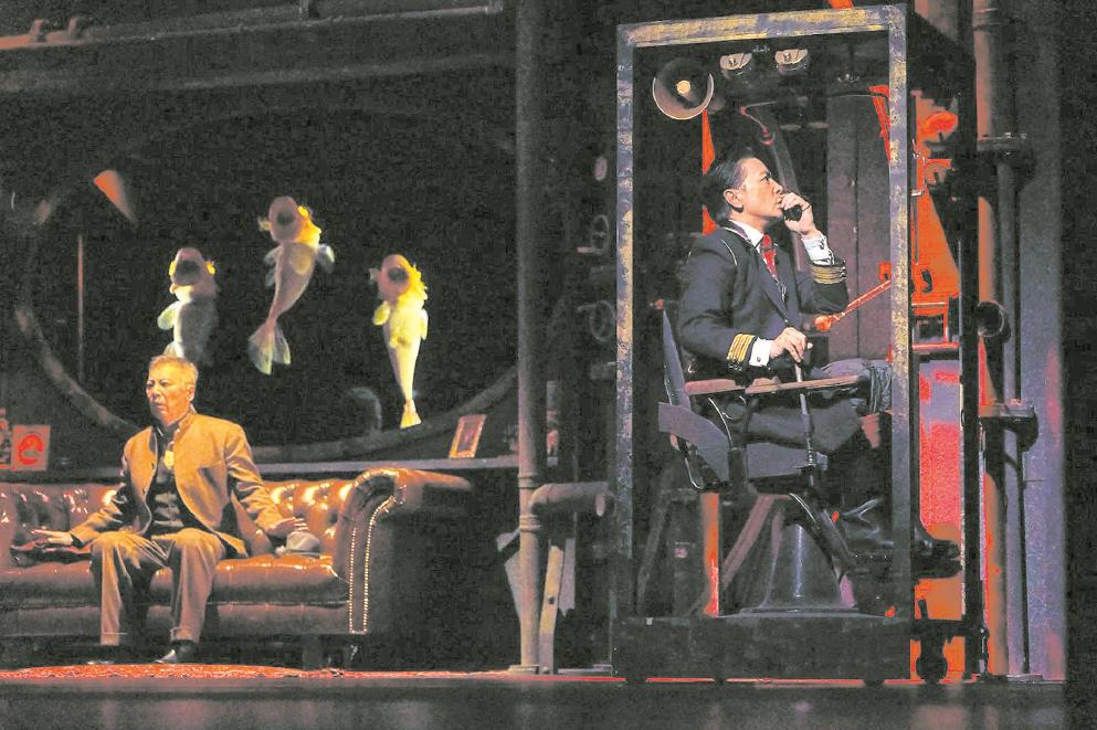 這種現(xiàn)代平等的角色人物關(guān)系與古典尊卑的角色人物關(guān)系形成了一組強(qiáng)烈的對照,兩對經(jīng)典喜劇組合在全劇中奉獻(xiàn)出了跨越古今、超越地域的幽默,喜劇表演里經(jīng)典的重復(fù)技巧被運用到了極致,英夾中的臺詞中巧妙地融入“奧掃西開”“哪能意思”等上海話,豐富的小丑肢體表演推動劇情發(fā)展增加滑稽感。種種喜劇元素的運用使原本厚重的原著自然而然地轉(zhuǎn)變?yōu)橐粓銮〉胶锰幍姆ㄊ捷p喜劇,不僅創(chuàng)造出一種全新的關(guān)于幽默的體驗,讓整個劇作在藝術(shù)表現(xiàn)上呈現(xiàn)出一種獨特的魅力,更為重要的是,這種角色關(guān)系的對照巧妙地映射出了尼摩船長與現(xiàn)代社會之間的割裂與背離。