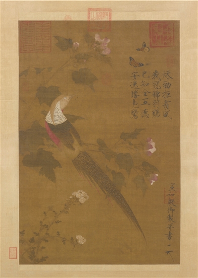 毫無(wú)疑問(wèn),祥瑞是古代政治文化中的重要元素。無(wú)論是真實(shí)存在的動(dòng)物,還是想象的動(dòng)物,都披上了一層神秘的色彩,它們的出現(xiàn)象征著上天對(duì)君王身份的認(rèn)可,對(duì)他們功績(jī)的表彰。因此,古代帝王喜歡借祥瑞的圖案宣揚(yáng)其政績(jī),其中最為不遺余力者當(dāng)屬宋徽宗趙佶。在他創(chuàng)作的《瑞鶴圖》中,群鶴盤(pán)旋宮殿之上,引以為祥瑞之兆,本展中也選了一幅他的《芙蓉錦雞圖》,顏色鮮艷的錦雞棲于芙蓉枝頭向上眺望,周?chē)腔▓F(tuán)錦簇蝴蝶翩翩,甚是熱鬧。