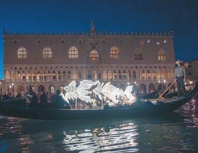 本屆威尼斯國(guó)際建筑雙年展期間,在威尼斯貢多拉船布置的“流動(dòng)的塱頭”藝術(shù)裝置。