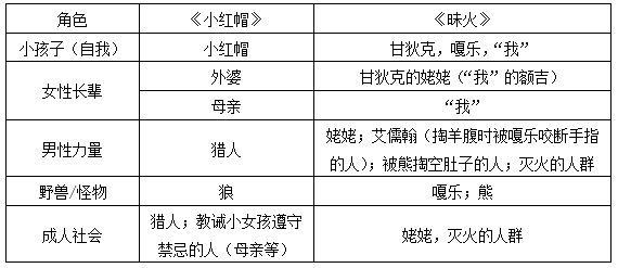 由于《昧火》對《小紅帽》的改寫可以說到了徹底顛覆的地步,其中人物所承擔(dān)的功能也很難與《小紅帽》中的人物嚴(yán)絲合縫地對應(yīng)。二者的關(guān)聯(lián)大致可以做如下對比: