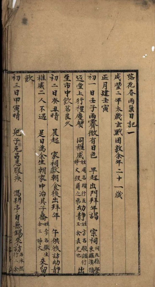 落花春雨巢日記五冊(cè) 清武進(jìn)趙烈文(惠甫)撰 手稿本 惠甫早年時(shí)日記草稿本。每半頁(yè)十行,直行格次紙。自咸豐二年至五年。