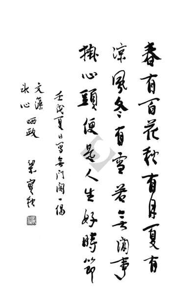 1982年夏,梁實(shí)秋在美國為吳文藻冰心夫婦寫下《無門關(guān)》:“春有百花秋有月,夏有涼風(fēng)冬有雪;若無閑事掛心頭,便是人生好時(shí)節(jié)?!蓖写笈畠毫何能缁貒鴷r(shí)代他贈(zèng)予幾十年未曾見面的老朋友。1983年,梁實(shí)秋的幼女梁文薔從臺灣回北京探親,她遵照父親的囑托,與一直生活在北京的姐姐梁文茜一同探望了患病住院的冰心。