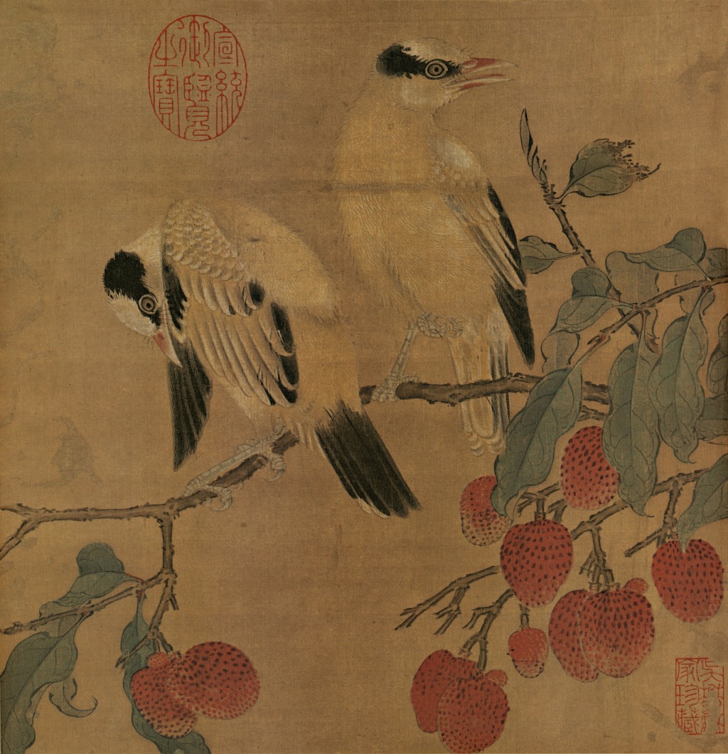 《寫生翎毛圖》融合寫實與象征,展現(xiàn)北宋宮廷花鳥畫的高超水平。據《老學庵筆記》所述:“宣和中,保和殿下種荔枝,成實?;諒R手摘,以賜燕帥王安中。”據傳此荔枝樹是徽宗在皇宮保和殿種下的,并畫了此畫。盡管真?zhèn)稳杂袪幾h(或是畫院人筆,或是后人仿本),但其藝術價值無可否認。