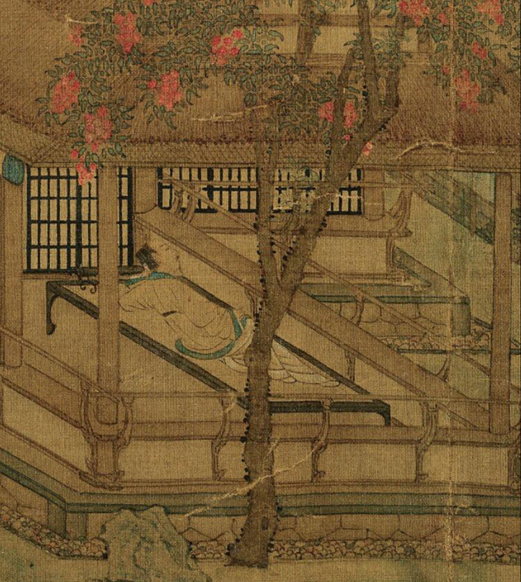 宋《荔院閑眠圖》(局部)紅色荔枝綴滿枝頭,高士倚臥榻上,有夏日乘涼之美意。