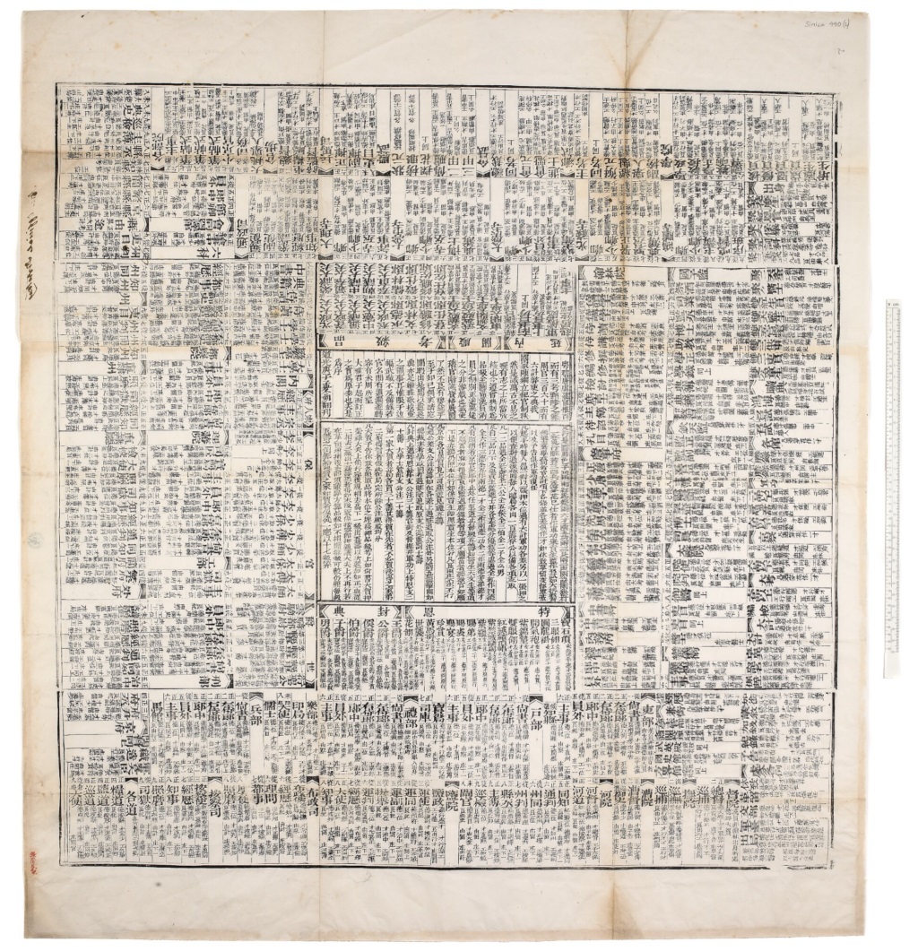 回到主題,就是牛津大學(xué)所藏這幅升官圖(Bodleian Library Sinica 440/2)。這幅圖為雕版印刷品。據(jù)牛津大學(xué)蘇諾教授見告,該圖原著錄為《升官圖》,題明倪元璐作。清道光庚子(1840)廣東刊。大小為82x75厘米,有“張隆盛制”朱文印記。1877年入藏,由曾駐扎香港的英軍98步兵團的Lawrence Shadwell將軍捐贈。本圖最中心位置說明文字的落款為“道光庚子孟冬朔翻刊”,可以知曉本圖並非創(chuàng)制,而是翻刻前人所作而成。但既然是道光時候翻刻,說明本圖所錄,當(dāng)為清代官制。整張圖由五塊雕板拼接而成。以此說明文字為中心,其上下兩條各為一塊板,說明文字所在之最中心為一塊板,左右兩邊又各一塊板。正是因為整圖是拼接而成,所以在印刷上存在一定的技術(shù)要求,稍有不慎,便會發(fā)生文字重疊或者模糊現(xiàn)象。本圖中左部分(以說明文字為參照)文字多有重影,便是在印刷時版片沒有對齊壓實而造成的失誤。本圖文字共分上下左右四個方向,分別據(jù)各方向來閱讀。因此之故,即便是同一塊板子,其上所刻文字方向也有不同,如最下一條版中,就有向下,向左、向右三種方向的文字。而這無疑增加了很多刻版的難度。本圖雖然是一張平面圖,但顯然是借用了很多書籍的元素,如除了利用板框本身來分割不同部分之外,還借用了書籍中常用的黑魚尾來進行分類,令版面顯得清晰而活潑。